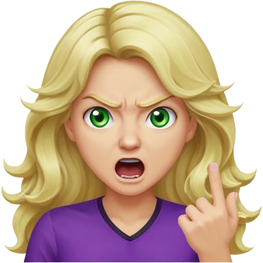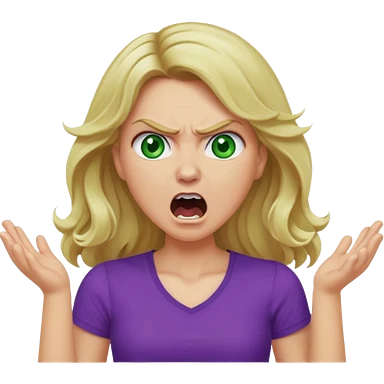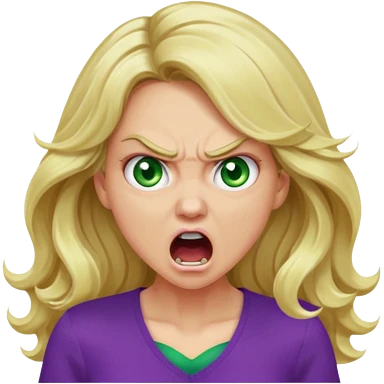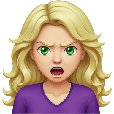 lady with long wavy blonde hair, purple top, green eyes, shouting and looking very angry emoji