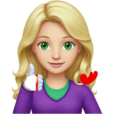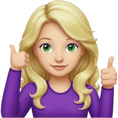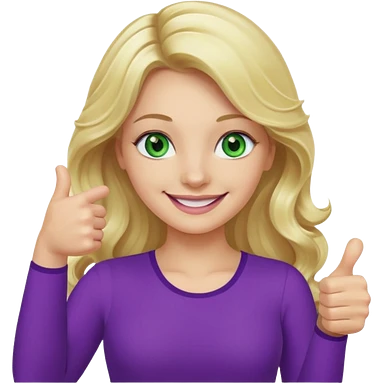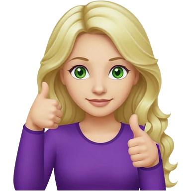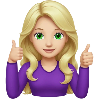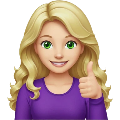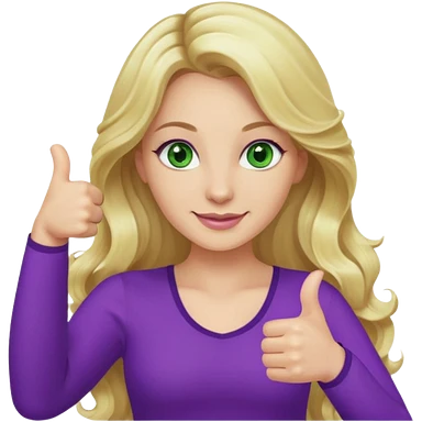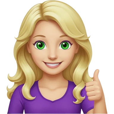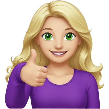 lady with long wavy blonde hair, purple top, green eyes, thumbs up emoji
