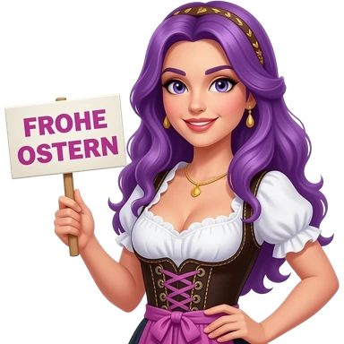 sexy girl with long purple hair wearing a dirndl holding a FROHE OSTERN sign emoji