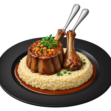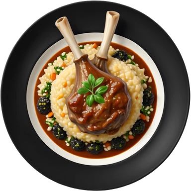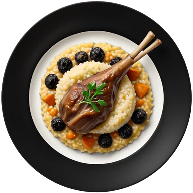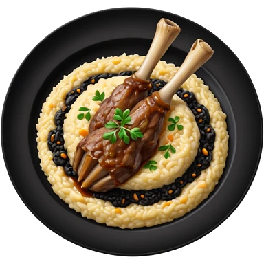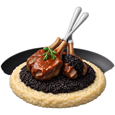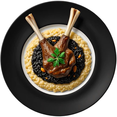 Lamb Shanks with Risotto Nero on a black plate emoji