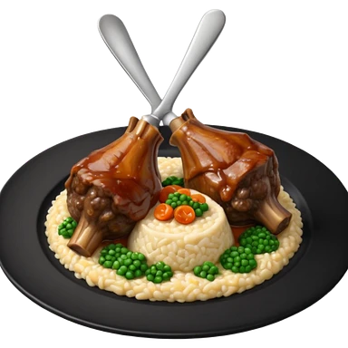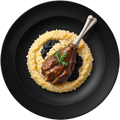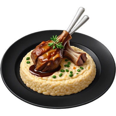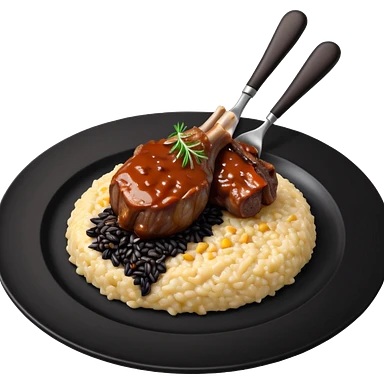 Lamb Shanks with Risotto Nero on a black plate-no cutlery emoji