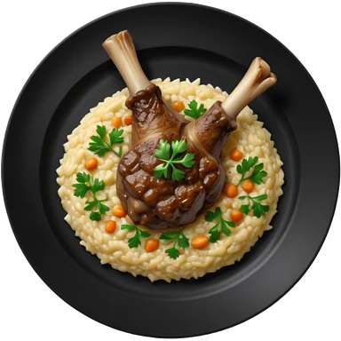 Lamb Shanks with Risotto Nero on a black plate, top view emoji