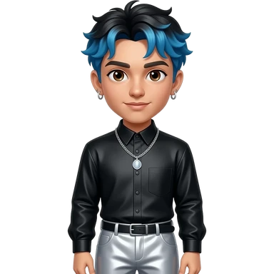 Rauw Alejandro with brown eyes, black hair with periwinkle blue dyed, black metallic high neck shirt, silver metallic baggy pants, necklace and earrings emoji