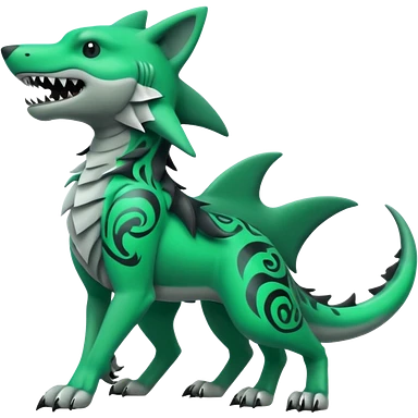 Edgy cool badass Neon-green landhai-sergal-wolf-canine, with a shark tail, with black and dark-green swirly patterns markings emoji