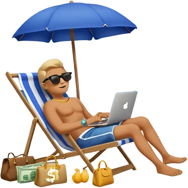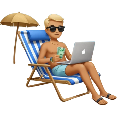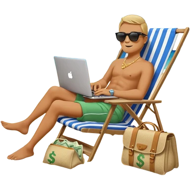 Emoji-style person relaxing on beach chair with laptop and money bag, “$20K” written in sand, sky gradient background, calm and successful tone emoji