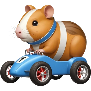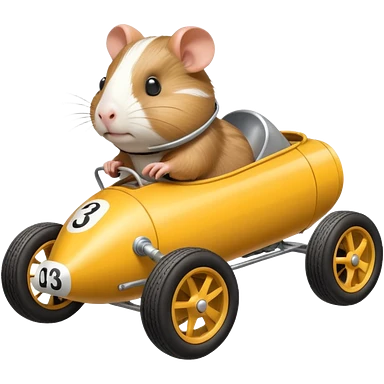 Special air-cooled three-cylinder race car whose frame and suspension is made of shopping cart material with a large rear-mounted gas tank, a soft racing seat, and rear spoiler, is being raced by a small Guinea pig emoji