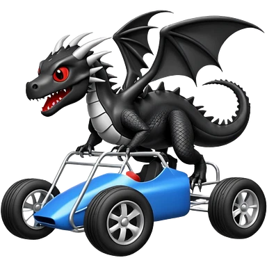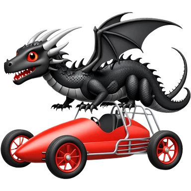 Special air-cooled three-cylinder race car whose frame and suspension is made of shopping cart material with a large gas tank, and rear spoiler, is being professionally steered/driven by a small dark-colored dragon emoji