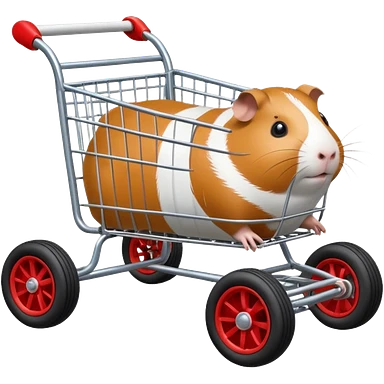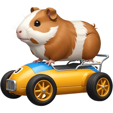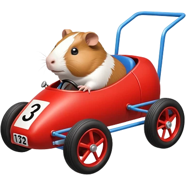 Special air-cooled three-cylinder race car whose frame and suspension is made of shopping cart material with a large rear-mounted gas tank, and rear spoiler, is being piloted by a small Guinea pig emoji