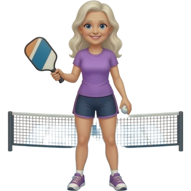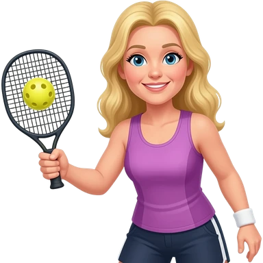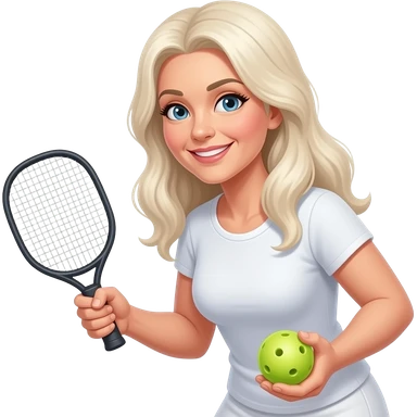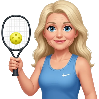 athletic grandma pickle ball player with long blond hair holding a paddle and one pickle ball emoji