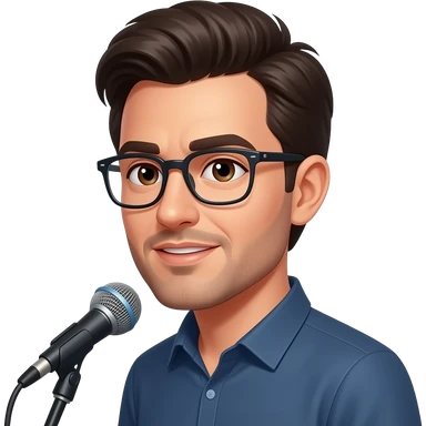 Парень лет 30, темноволосый, с карими глазами, в очках, с короткой бородой, которая проходит вдоль линии подбородка и соединяется в маленькую полоску под нижней губой и короткими усами но они не соеденены с бородой, щёки выбриты, со средней длиной волос , стоит в профиль и говорит что-то в микрофон emoji