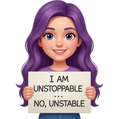 girl with long purple hair with a I AM UNSTOPPABLE... NO UNSTABLE sign emoji