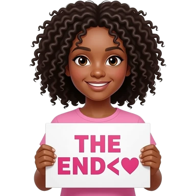 Black girl with curly hair and a pink shirt holding a white sign with big pink letters saying< THE END<3 emoji