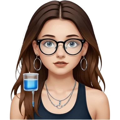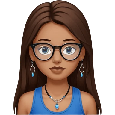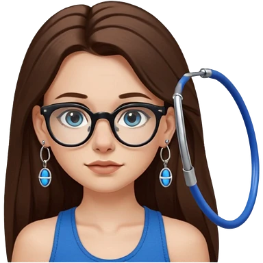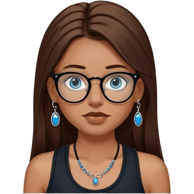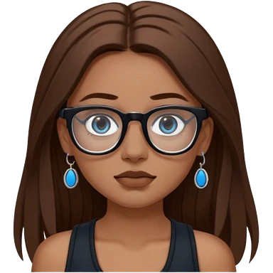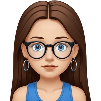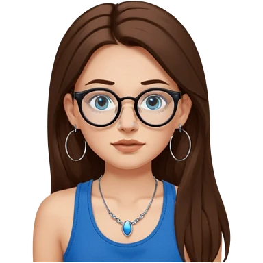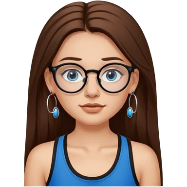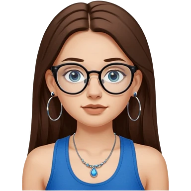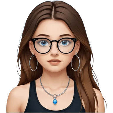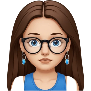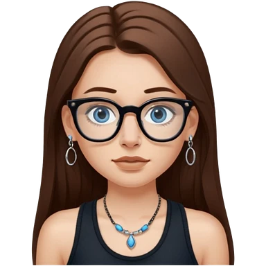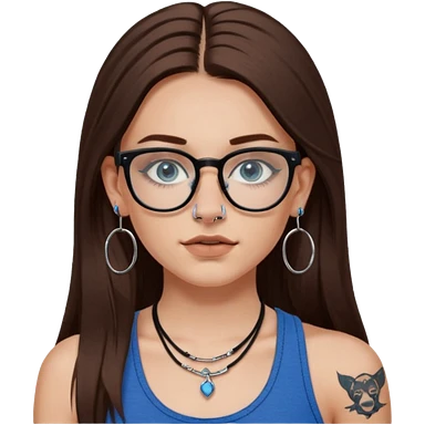 WHITE girl with long brown hair, part going more to the RIGHT side, BLUE eyes, wearing BLACK rectangle plastic frame glasses. SEPTUM nose piercing hoop (at bottom of nose) AND stud nose piercing on right side of nose. Wearing BLACK tank top. emoji