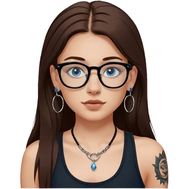WHITE girl with long brown hair, part going more to the RIGHT side, BLUE eyes, wearing BLACK rectangle plastic frame glasses. SEPTUM nose piercing hoop (at bottom of nose) AND stud nose piercing on right side of nose. Wearing BLACK tank top. Arm tattoos. Hoop earrings emoji