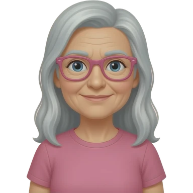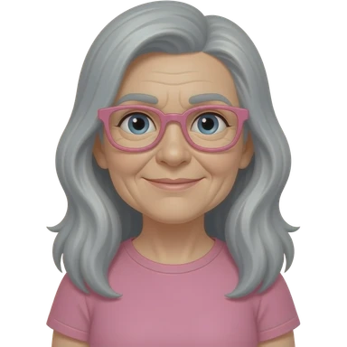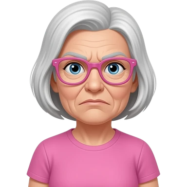 Une femme âgé avec des lunette rose et de long cheveux gris et un nez crochu et un t-shirt rose qui crit emoji