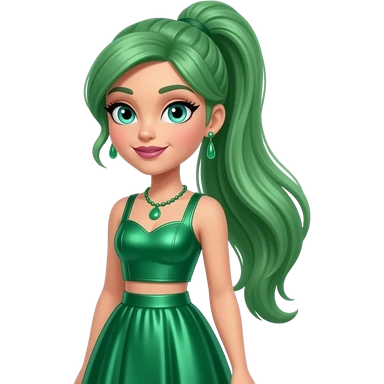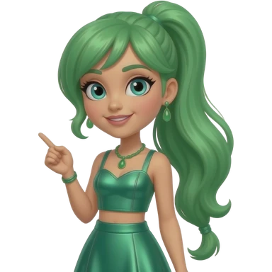 Jade Hunter from Rainbow High with turquoise eyes, long green ponytail hair, green metallic sweetheart crop top and long skirt, green necklace and earrings emoji