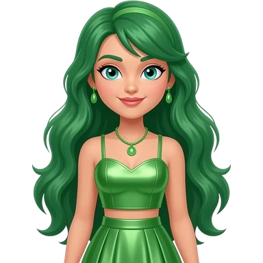 Jade Hunter from Rainbow High with turquoise eyes, long green hair, green metallic sweetheart crop top and long skirt, green necklace and earrings emoji