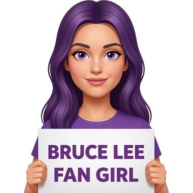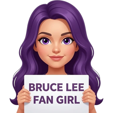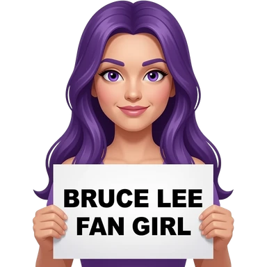 sexy girl with long purple hair and purple eyes holding BRUCE LEE FAN GIRL sign emoji