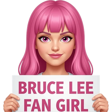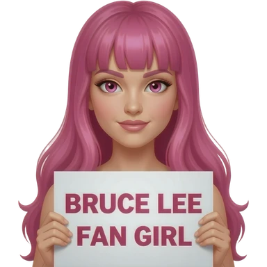 sexy girl with long pink hair and pink eyes holding BRUCE LEE FAN GIRL sign emoji