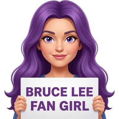 sexy girl with long purple hair and purple eyes holding BRUCE LEE FAN GIRLsign emoji