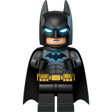 "LEGO-style Batman striking a dramatic hero stance with chest forward, glowing blue eyes, arms slightly raised, standing confidently against a dark blue gradient background, cinematic lighting emphasizing power and intimidation. emoji