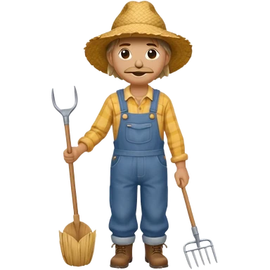 Scarecrow, Dressed like a farmer with overalls, straw hat, and a rake tucked in one arm, body on stick emoji