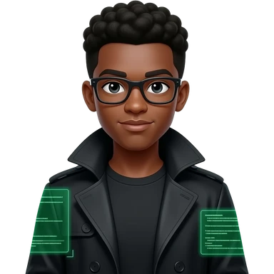 A young Black tech geek in a Matrix-style world, surrounded by green code and holographic UI. Black trench coat, smart glasses, cinematic cyberpunk lighting, ultra-realistic. emoji