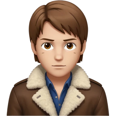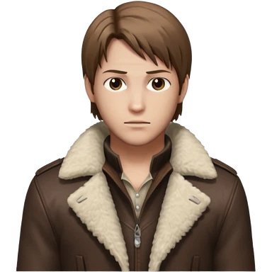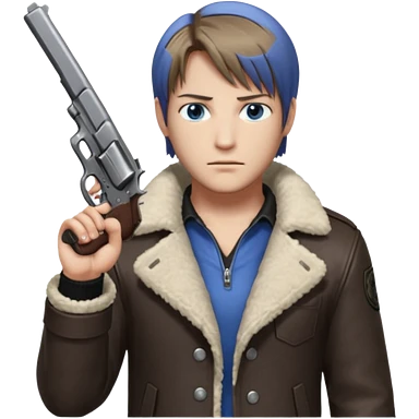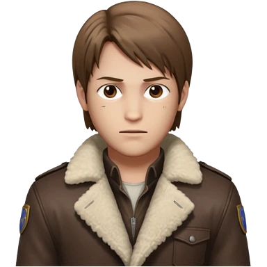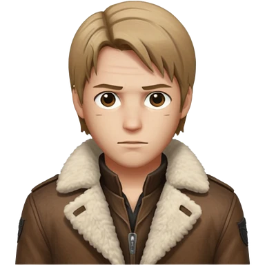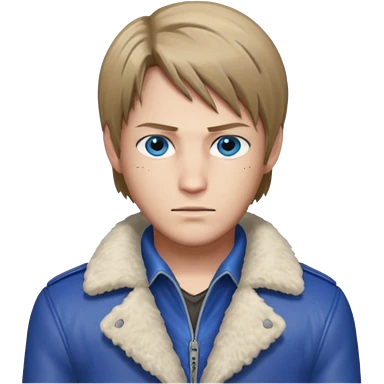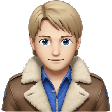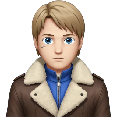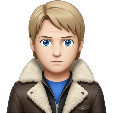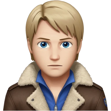 Leon Kennedy from resident evil 4 remake in sheepskin coat and black t-shirt blue eyes clean-shaved emoji | AI Emoji Generator