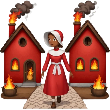 handmaids tale style woman burning house down walking away from house. shes wearing the nun hands maid tale hat cant see her face with brown hair shes wearing the red handmaids tale costume with white bonnet. walking away from the house emoji