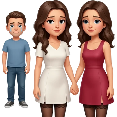 Lesbians with white skin and long black hair blushing at each other. emoji