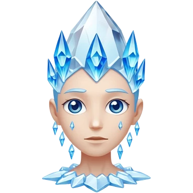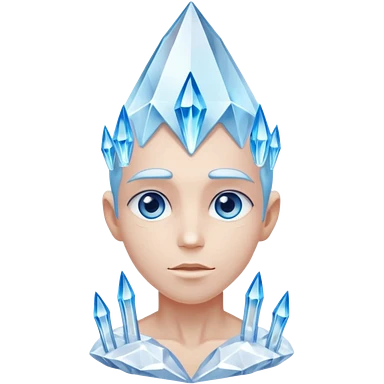 A single crystal character inspired by a clear quartz cluster, chunky base with many tall transparent crystal spikes growing upward all around it with a face emoji
