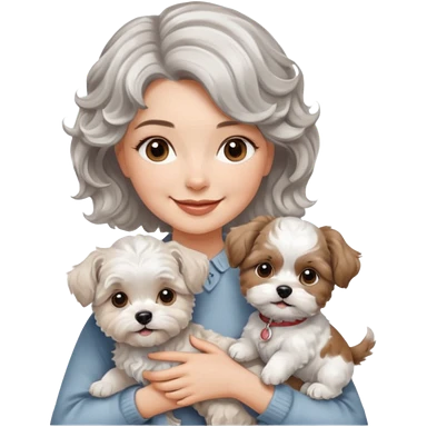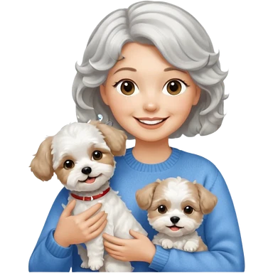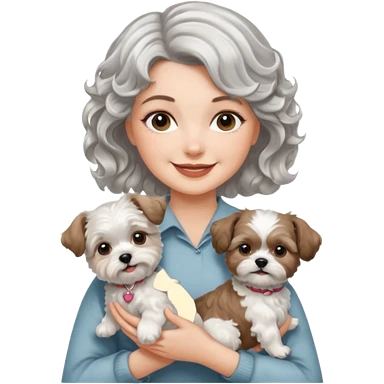 silver, short, wavy-haired with loose curls, smiling pretty lady holding a whit terrier dog and a white and tan shih tzu dog emoji