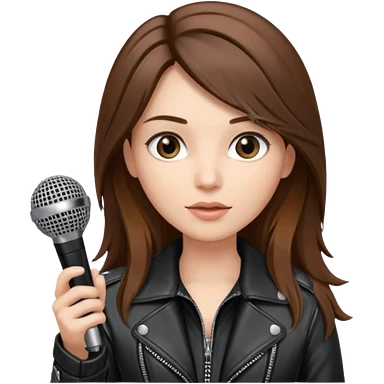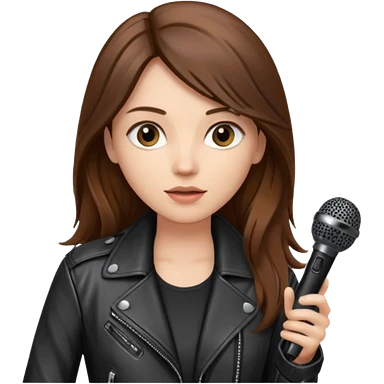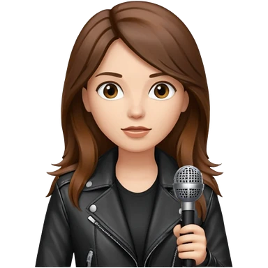 Pretty White Woman, Long Brown Wavy Hair, Brown Eyes, with black eyeshadow Wearing A Pink top and a Black Leather Jacket, holding a microphone emoji