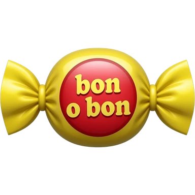Minimalist emoji-style illustration of a classic candy ‘Bon o Bon’. Centered composition, clean vector style, soft shading. The candy is wrapped in a bright yellow twisted wrapper on both ends, with a glossy red circular label in the center that clearly reads ‘bon o bon’ in lowercase yellow letters. emoji