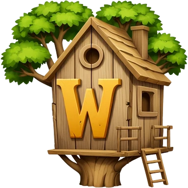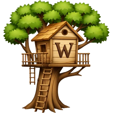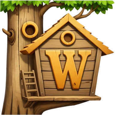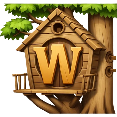 letter W on the side wall of a treehouse in a tree, top leaves visible emoji