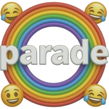 name "parade" in white typography lettering, each color of the rainbow as a border outlined around each letter, isolated, 3d rendering, no emoji icons no emoji faces and must have no human figures emoji