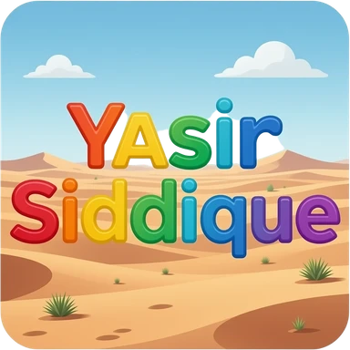 a Picure of the rainbow colored letters of a name call Yasir Siddique backround is the desert emoji