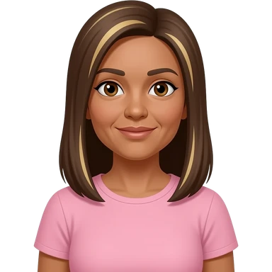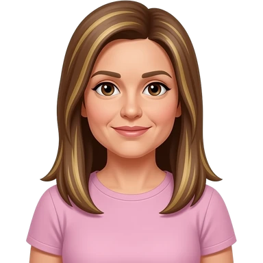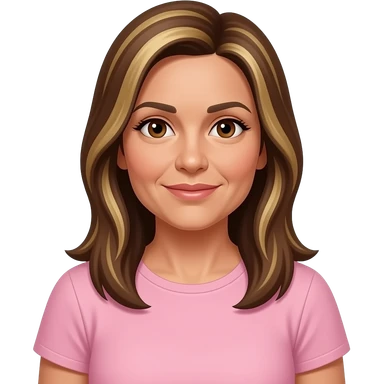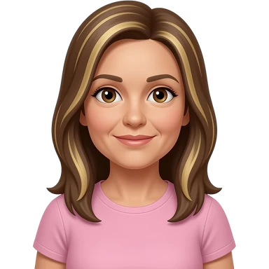 LI - woman, brown eyes, early 50s, brown long straight hair with blonde highlights, light pink t-shirt and tanned skin emoji