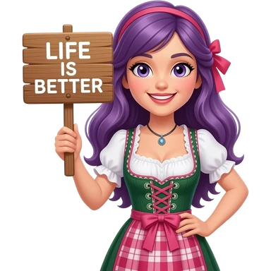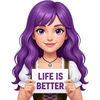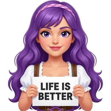 sexy girl with long purple hair and purple eyes wearing a dirndl holding a LIFE IS BETTER in a DIRNDL sign emoji
