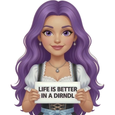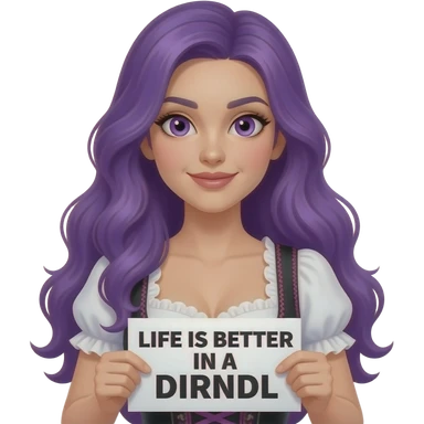 sexy girl with long purple hair and purple eyes wearing a dirndl holding a LIFE IS BETTER IN A DIRNDL sign emoji
