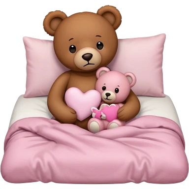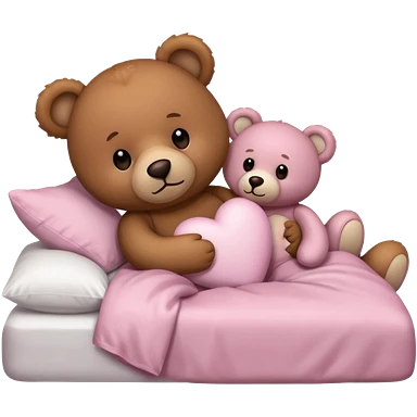 Brown teddy bear cuddling with a light pink teddy bear in bed emoji