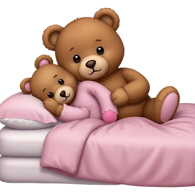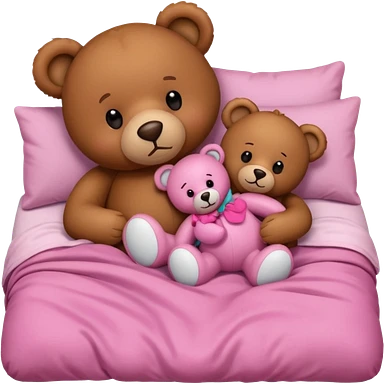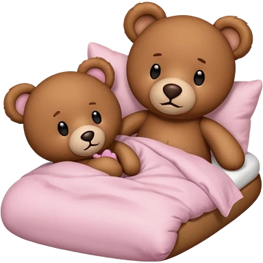 Brown teddy bear laying with a light pink teddy bear in bed emoji
