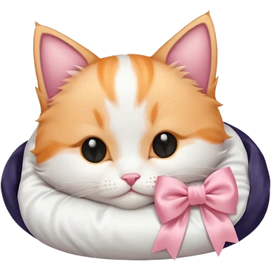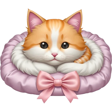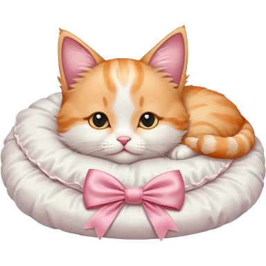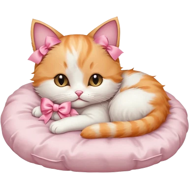 light orange and white kitten with a satin pink bow sleeping on a satin white cat ed emoji