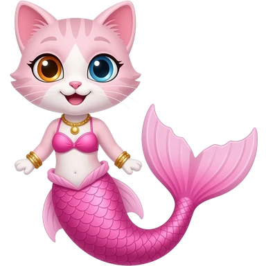 a light pink cat with orange eye blue eye smile #E37383 hair golden bracelets #FFB6C1 top bikini #FF69B4 mermaid tail with #F8C8DC tail fins emoji
