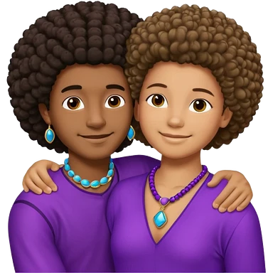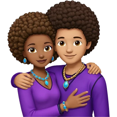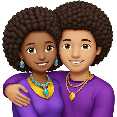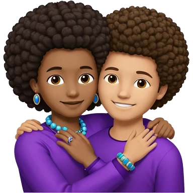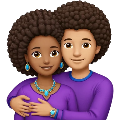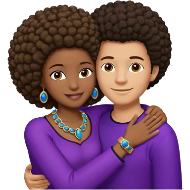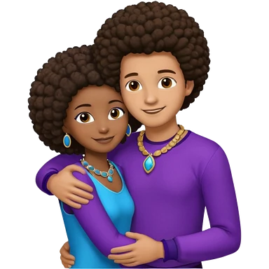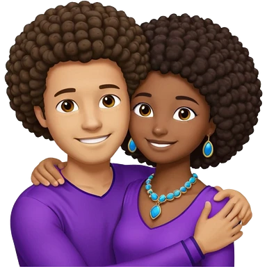 Tan male with short straight, light wavy hair, smiling and hugging a darkblack African girl with Afro in purple clothes with blue jewelry emoji