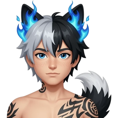 short grey hair and half black hair with white tips on hair ends, has freackles on nose and cheeks, with two blue flames on head, black fire, Wolf ears, and a fluffy long fur wolf tail, a lean muscular body, with black tattoos, and light blue bright eyes, emoji