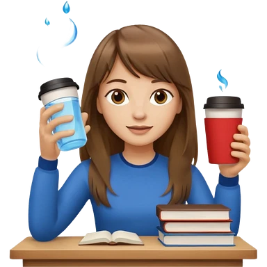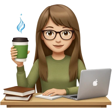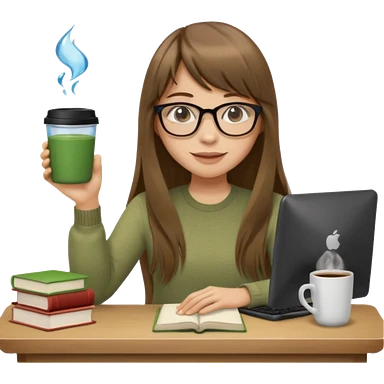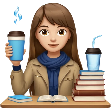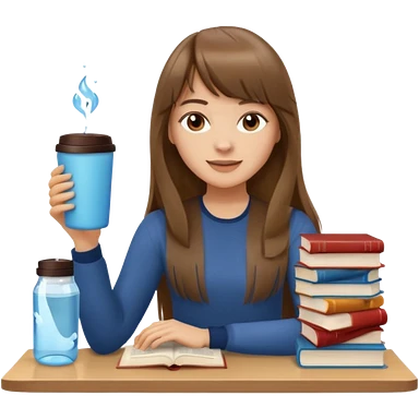 a designer with light skin long brown hair bangs waving, stack of books, coffee cup on top, water bottle, computer, matcha, no glasses emoji