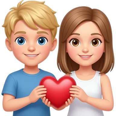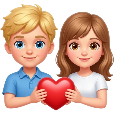 Make a boy with blonde hair and blue eyes and a girl with light brown hair with brown eyes hold a heart emoji