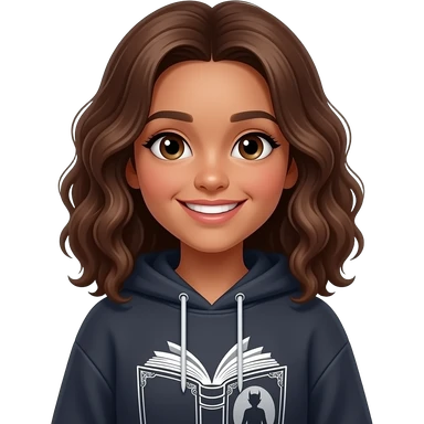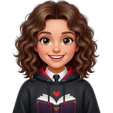 light brown skin 13 yo girl with dark brown loose curls medium length hair who is grinning and wearing a vampire/book themed sweatshirt emoji | AI Emoji Generator