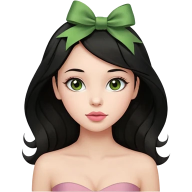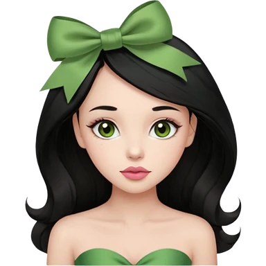 The woman has long black hair with green ribbon bows, light brown eyes, fair skin, and a heart-shaped face. She wears soft makeup, a muted rose lip, and a strapless olive green top. emoji
